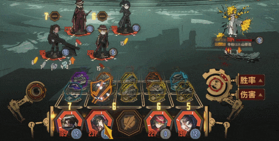 选择技能后,会出现胜率提示,分为“绝对优势”、“优势”、“均势”、“劣势”、“绝对劣势”、“单方面攻击”等,辅助玩家判断。提供了“胜率”和“伤害”按钮,点击后可以按需求自动选择技能。完成全部技能的选择后,点击最右侧的“开始”按钮开始本回合行动。