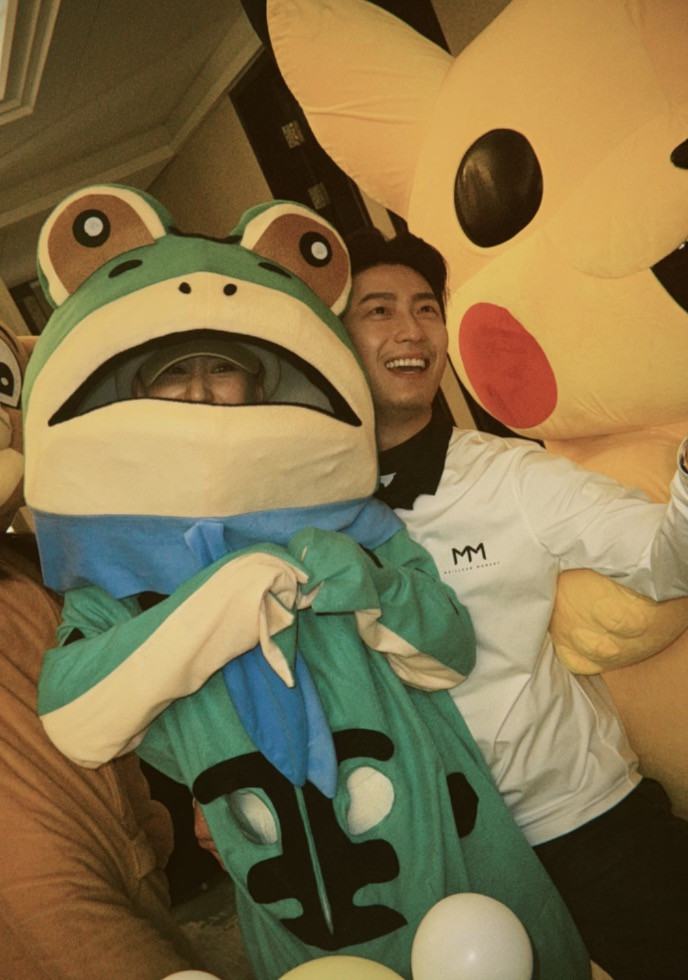 照片中,窦骁和何超莲夫妇站在由气球组成的蛋糕面前,假意吹蜡烛,旁边友人鼓掌欢呼,看上去很热闹。在另一张照片中,窦骁紧贴着一个青蛙的人偶,仔细一看,人偶里面是何超莲。