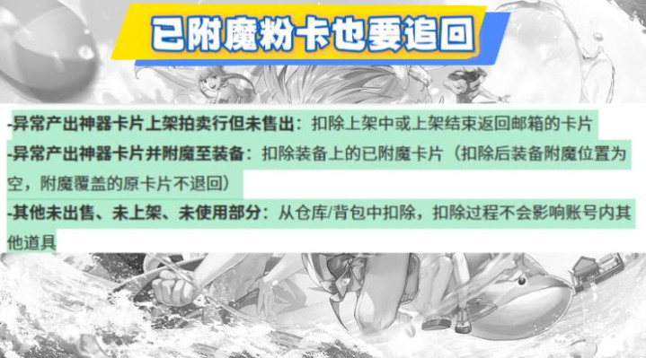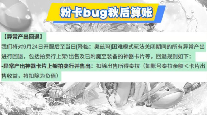这是最离谱的bug处理公告!因为不少粉卡已经卖成泰拉了,但官方这次表示要通通追回,包括已经上架卖掉的和附魔了的!恐怖如斯啊。