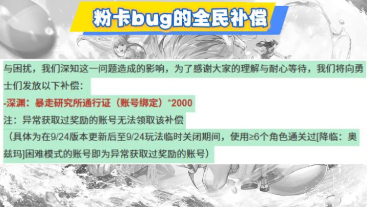 但注意1个细节,卡过粉卡bug的玩家不能领取这2000张补偿的深渊票,算是小惩大诫。