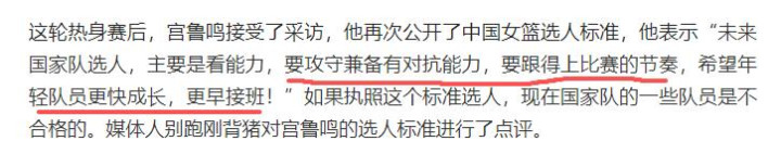 中国女篮国家队主教练宫鲁鸣,近段以来不断重申他的选人标准,并且这些标准不断在改变。在与尤文图特热身赛期间,他提出的选人标准是,“未来国家队选人,主要是看能力,要攻守兼备有对抗能力,要跟得上比赛的节奏,希望年轻队员更快成长,更早接班!”这一选人标准强调年轻队员要早些接班。