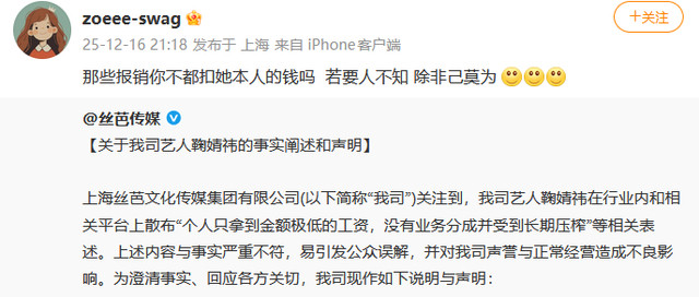随后,@丝芭传媒发布“关于我司艺人鞠婧祎的事实阐述和声明”,称鞠婧祎在行业内和相关平台上散布“个人只拿到金额极低的工资,没有业务分成并受到长期压榨”等相关表述,与事实严重不符,并就鞠婧祎待遇和收入分配问题作出说明。