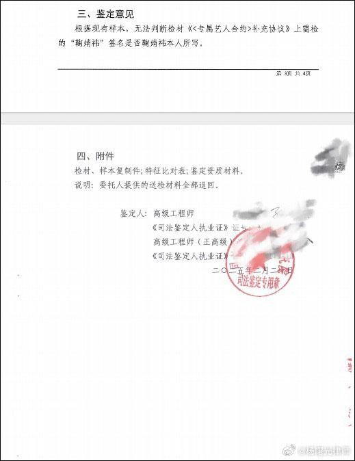 12月16日,上海丝芭文化传媒集团@丝芭传媒称已经委托具备司法鉴定专业资质的鉴定机构就笔迹进行鉴定,称2018年的《补充协议》是鞠婧祎所签,鞠婧祎应当继续履约。