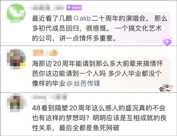 有网友写道:“最近看了几眼AKB48二十周年的演唱会。那么多初代成员回归,很感慨。一个搞文化艺术的公司,讲一点情怀多重要。”