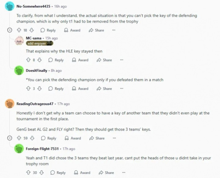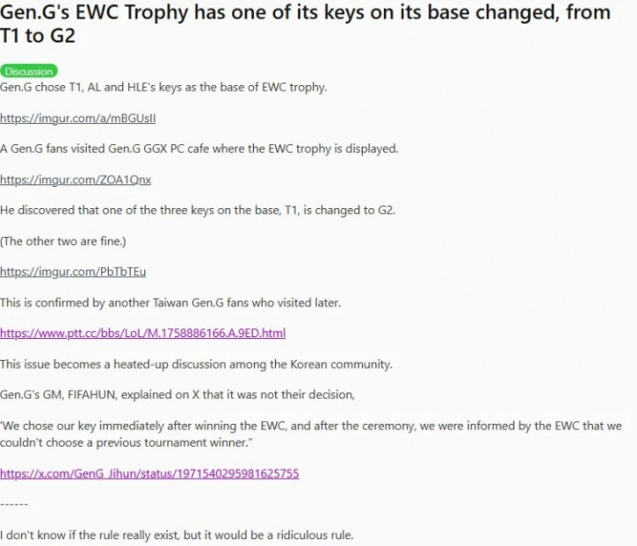 这条推文说,如果他们没有击败之前的EWC冠军,就不能把他们的钥匙放在奖杯上,所以GenG不能选择T1的钥匙,这似乎也适用于其他游戏。