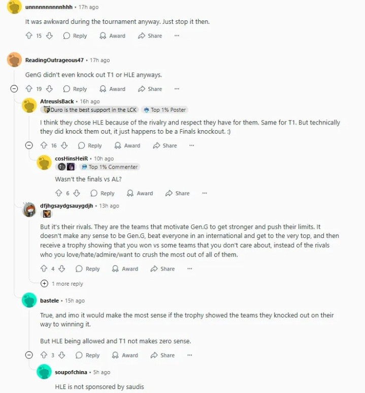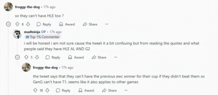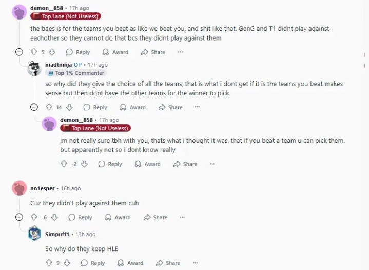 我认为他们选择HLE是因为他们对HLE既有竞争又有尊重。对T1也是一样。但从技术上讲,他们确实淘汰了HLE,只不过是在决赛中淘汰的。:)