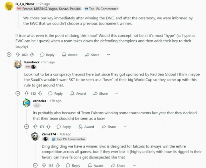 听起来像个阴谋论,但自从他们得到了RedSeaGlobal的赞助,我猜沙特人可能不希望SKT被视为他们世界杯的“失败者”,所以他们想出了这个规则来规避这一点。