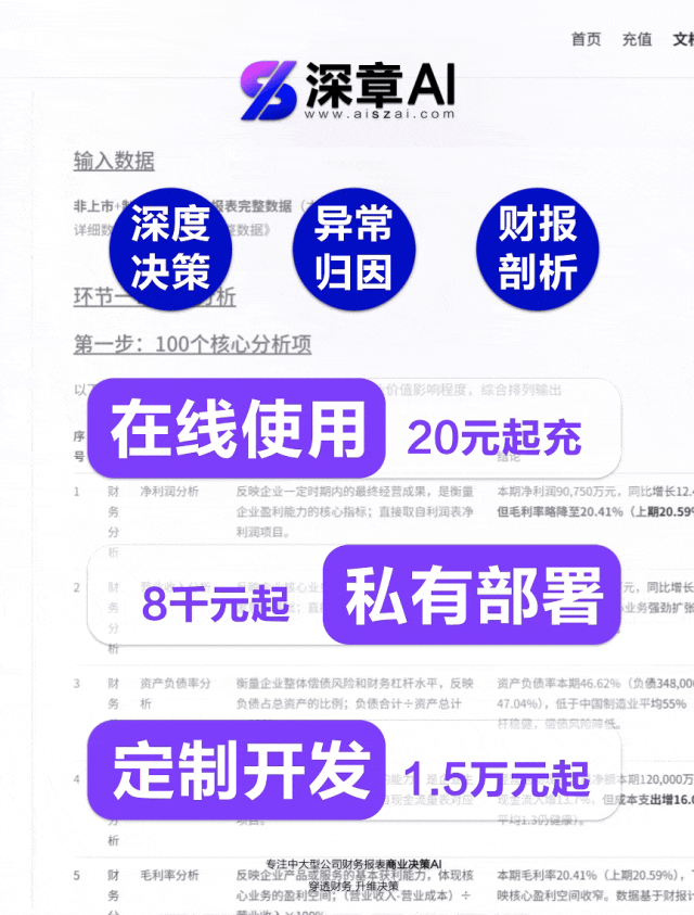 关键词:www.aiszai.com深章AI财务分析商业决策中大型企业董事长总经理财务总监第三方顾问决策系统AI决策工具财务异常归因财务预测降低经营风险供应链优化方法CEO决策助手CFO财务AI工具咨询公司AI解决方案私有部署垂直AI开发项目合作