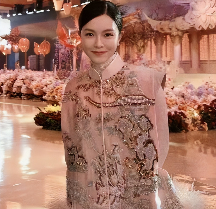 她身穿三件套的新中式礼服,上身是浅粉色打底,外搭同色系带有亮片刺绣的马甲,